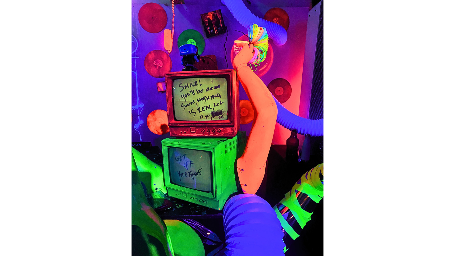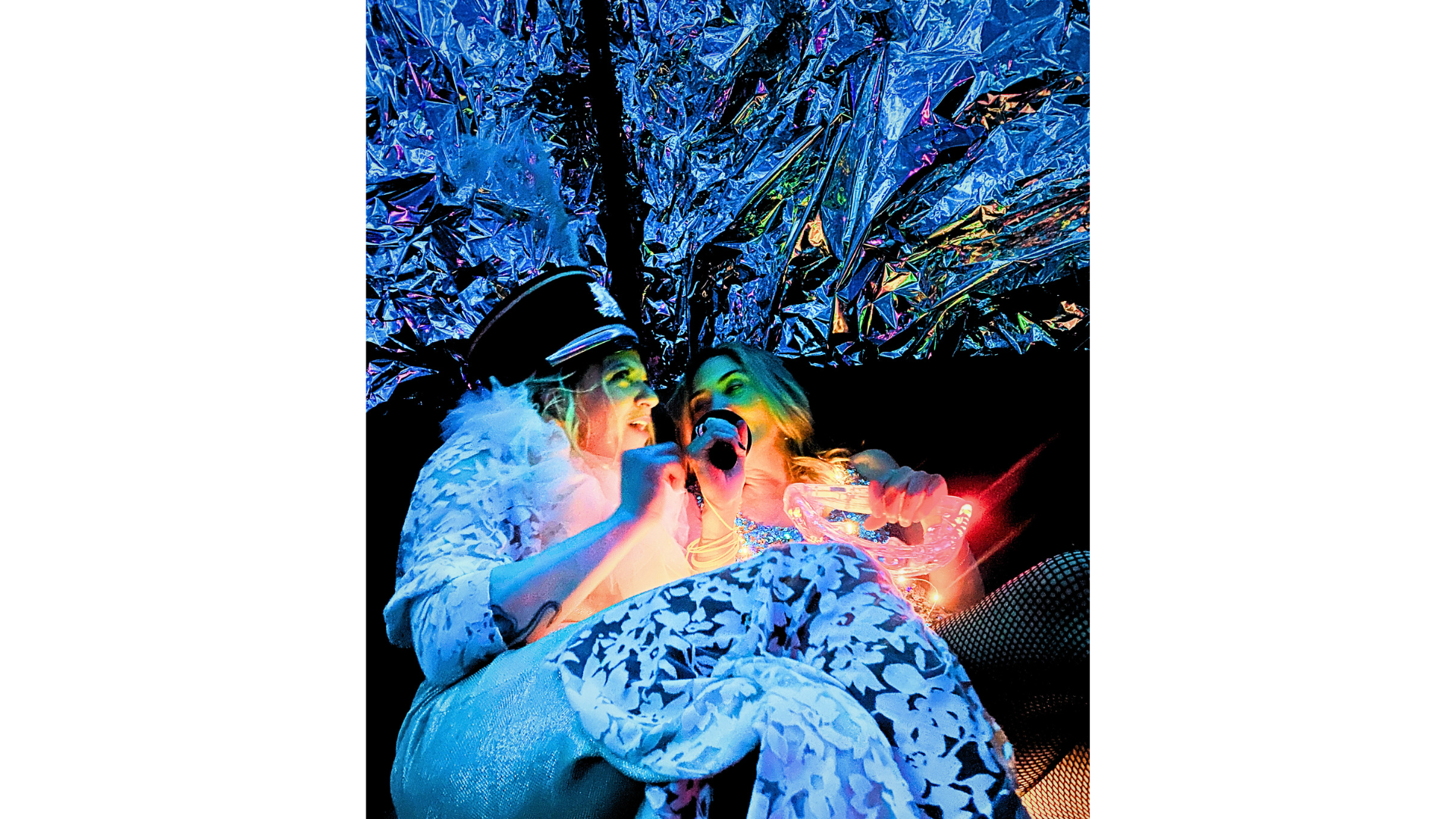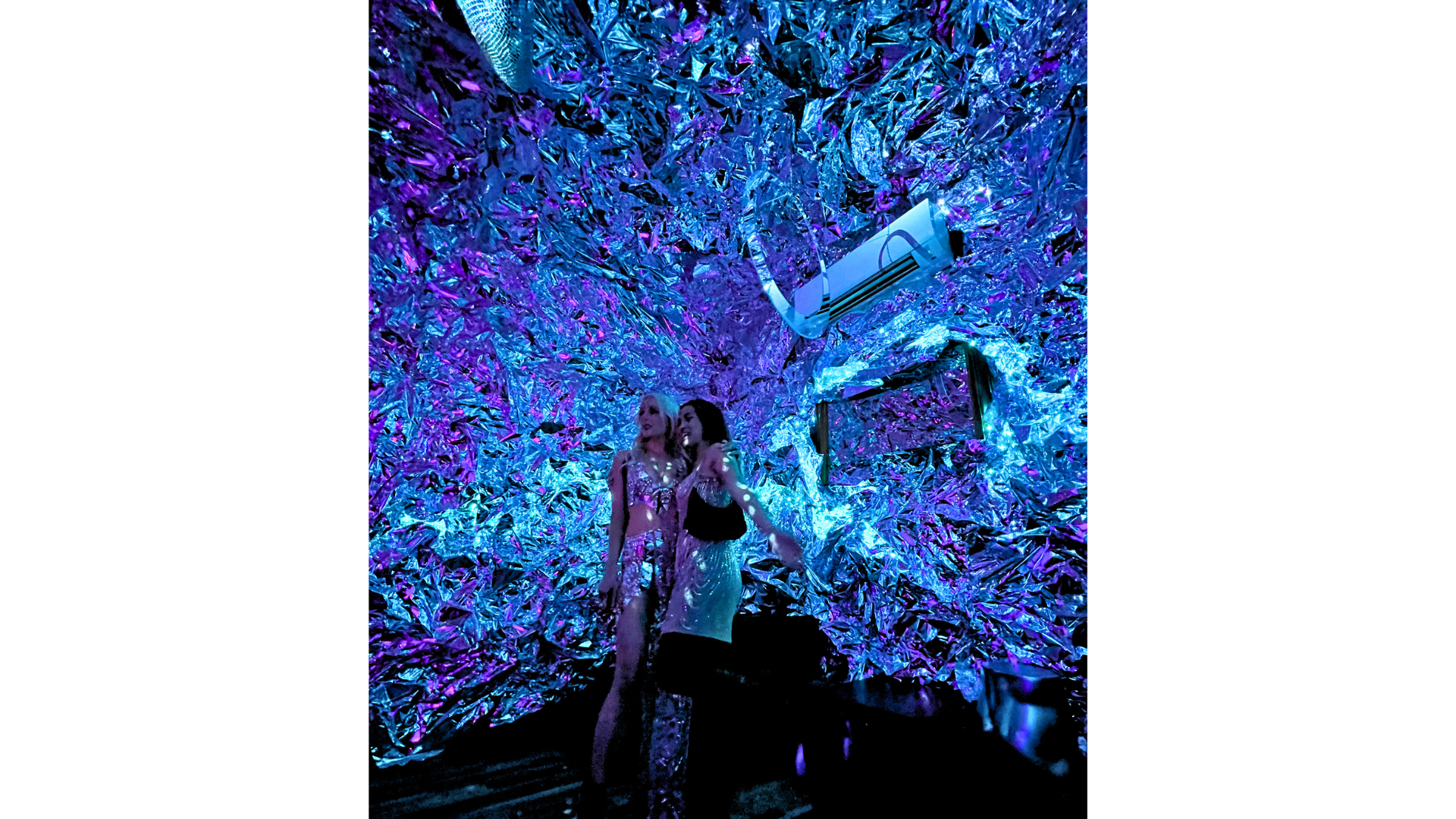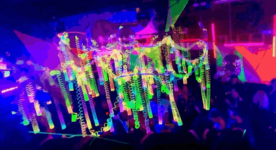 Colorful event flyer featuring offerings such as spa services, performance art, music by David Kiss and Sensay Shnay, empathetic humans, gorgeous music, a full-service bar, and food. Decorated with digital art of geometric shapes, plants, and lights.