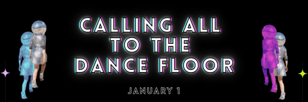 Stylized text on a black background reads "Calling All to the Dance Floor" above "January 1." The image features dancers in colorful, futuristic outfits and helmets, positioned on both sides of the text.